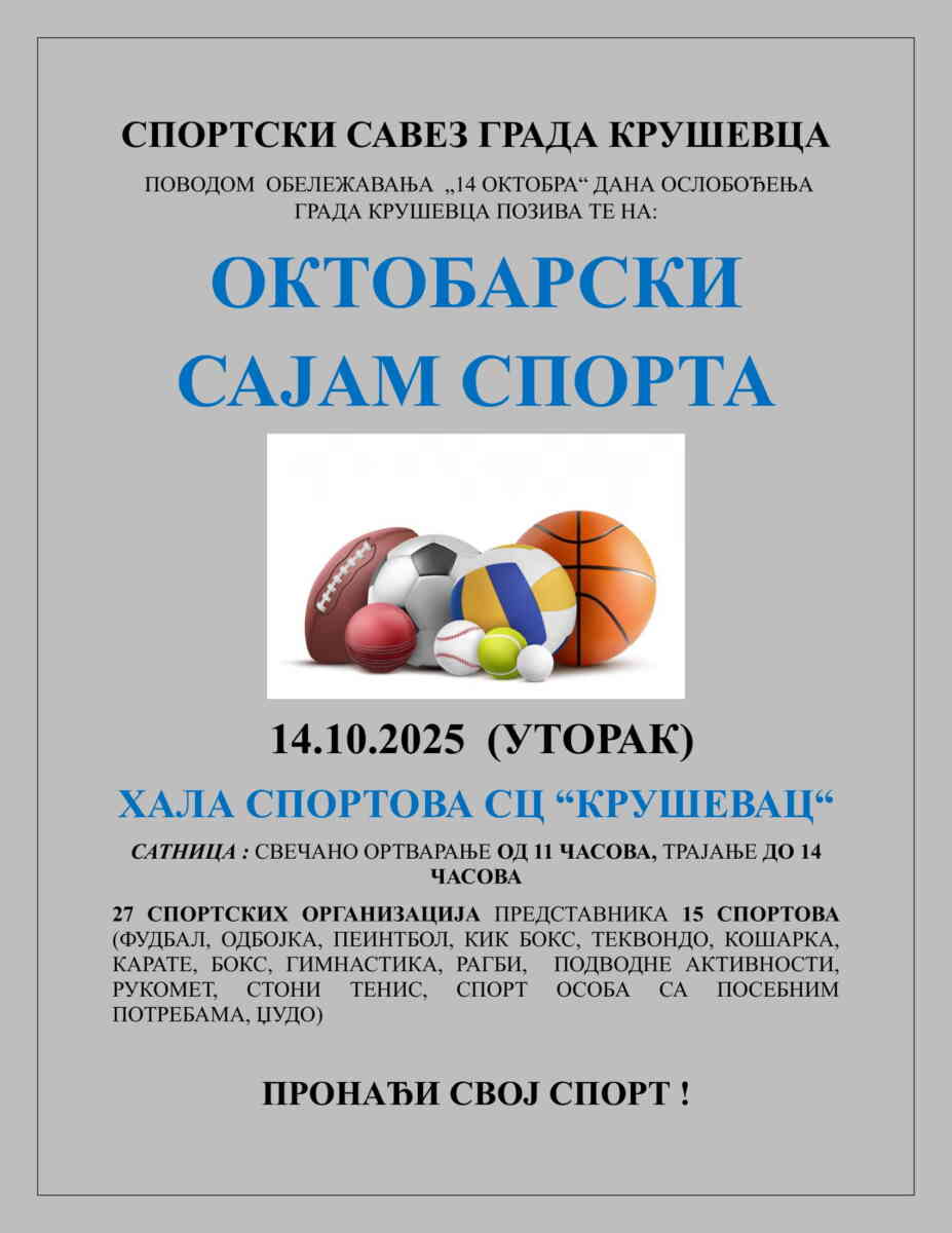 Обавештавамо ширу спортску јавност града Крушевца да ће се у уторак 14.10.2025. године у периоду од 11 до 14 часова у организацији Спортског савеза града Крушевца и Спортског центра Крушевац под покровитељством Града Крушевца у „Хали спортова“ у Крушевцу одржати „Октобарски сајам спорта„.